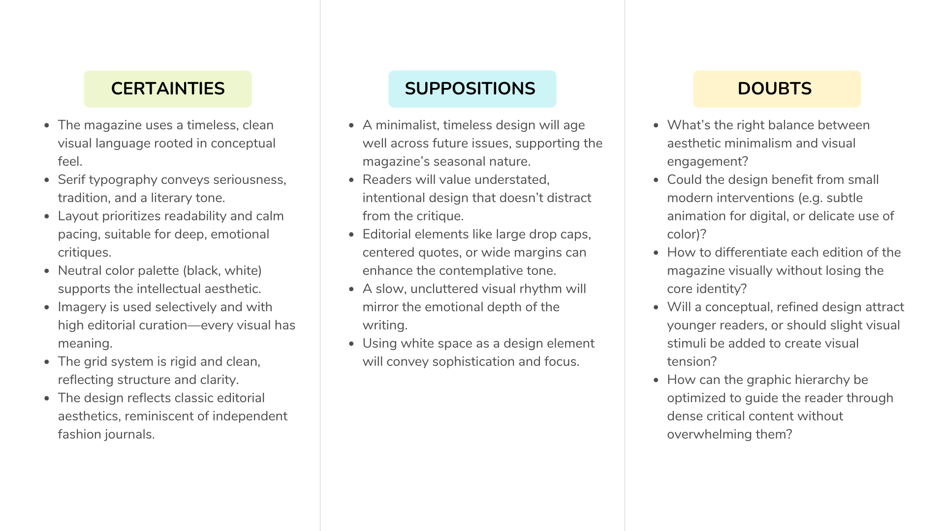 Deliver: Finalize the magazine layout and content, ensuring that it not only meets the high aesthetic standards of our audience but also communicates a deep, analytical narrative.